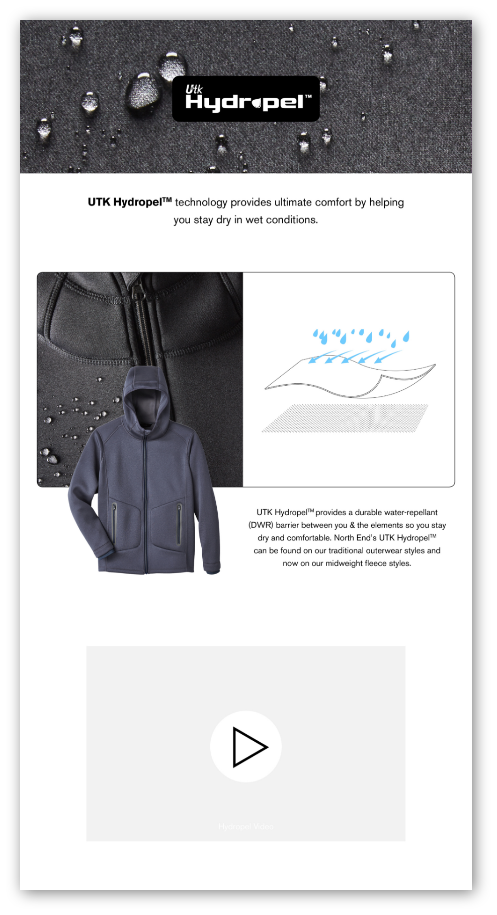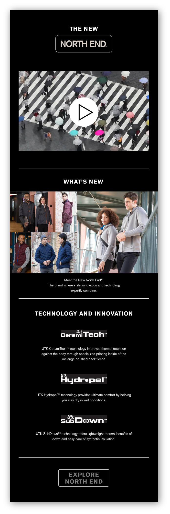 In 2019, We played a key role in the launch of North End's innovative outerwear collection, which introduced cutting-edge apparel technology to the promotional products industry. My work spanned across multiple creative and technical areas, beginning with the concept, storyboard, and art direction of a high-impact video shoot. I collaborated closely with an outside agency to bring the vision to life.